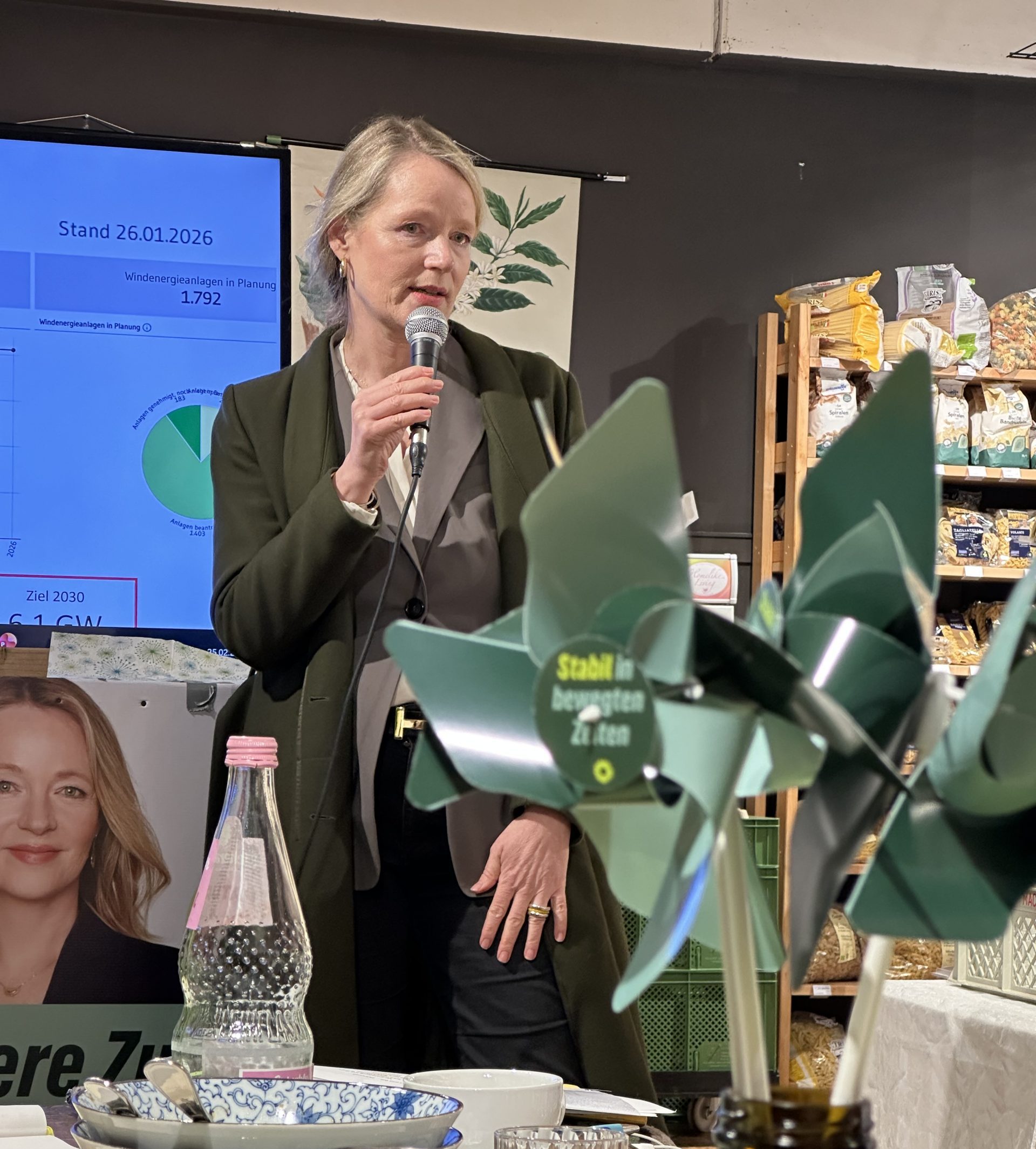 Nach Begrüßung und Einführung durch Kreisvorsitzende Ulrike Richter und Landtagskandidat Bennet Müller, sprach Thekla Walker klare Worte: Die Erneuerbaren machen uns unabhängig, sie sind günstiger als Kohle und Atom und dezentral ausgebaut kann jede Bürgerin und jeder Bürger davon profitieren.